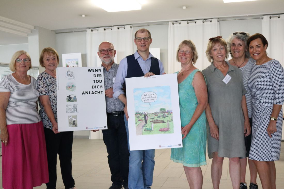 Ein Pfarrer steht alleine am Grab eines Verstorbenen und bemerkt lakonisch: „Auf Facebook soll er viele Freunde gehabt haben“. Diese und rund dreißig weitere ungewöhnliche Karikaturen verschiedener Künstler hängen derzeit im Kreishaus des Wetteraukreises am Europaplatz in Friedberg. Sie alle beschäftigen sich unter dem Titel „Wenn der Tod dich anlacht“ mit den Themen Tod und Sterben auf humorige und herausfordernde Weise.