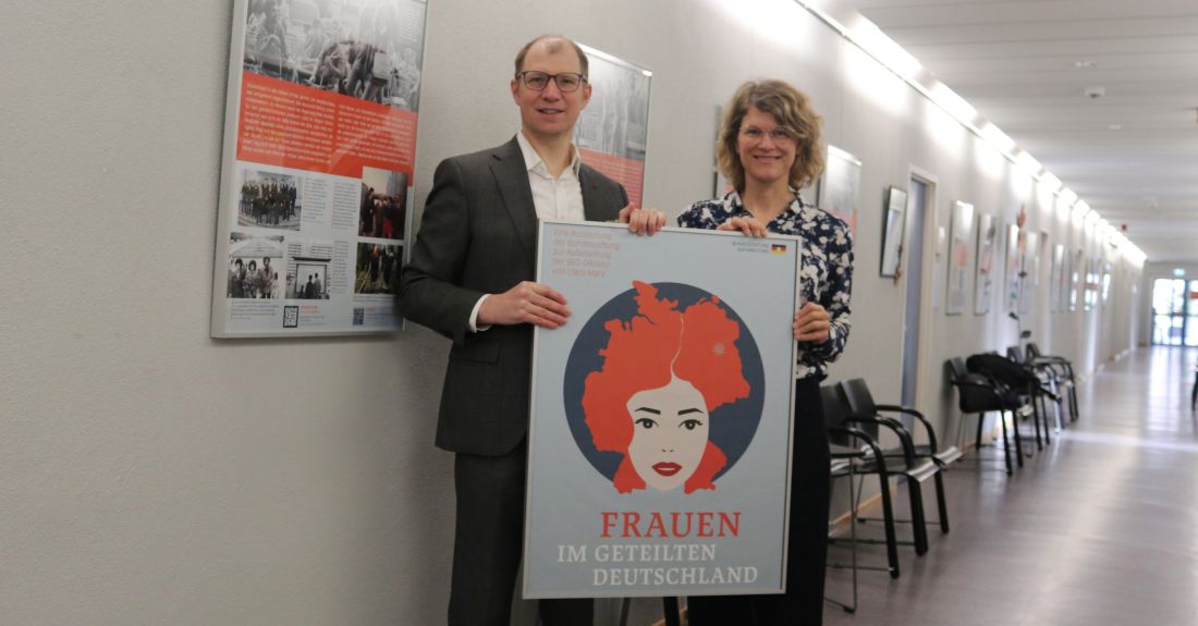 Woher kommen diese Zuschreibungen? Und was ist an ihnen dran? Die Plakatausstellung „Frauen im geteilten Deutschland“ will auf diese Fragen eine Antwort geben. Landrat Jan Weckler hat sie anlässlich des Weltfrauentages am 8. März gemeinsam mit Claudia Taphorn, Fachdienstleitung Frauen und Chancengleichheit, eröffnet. Die Westfrau wird oft entweder als „Heimchen am Herd“ oder als knallharte Karrierefrau beschrieben. Die Ostfrau hingegen steht im Kohlebergbau "ihren Mann". Sie wird als tough bezeichnet oder auch als Rabenmutter, weil sie ihre Kinder in die Krippe gibt. Die Westfrau gendert, während die Ostfrau damit nichts anzufangen weiß. Die Ostfrau gilt mal als Verliererin, mal als Gewinnerin der deutschen Einheit. Die Liste der Zuschreibungen ist lang. Obwohl sie sich teilweise grotesk widersprechen, zeugen sie doch alle von der Überzeugung, man wisse genau, wie DIE Ostfrau und DIE Westfrau eigentlich ticken. Vor allem eines scheint klar zu sein: Sie ticken alle gleich, aber im Vergleich zum anderen Teil Deutschlands sehr unterschiedlich.