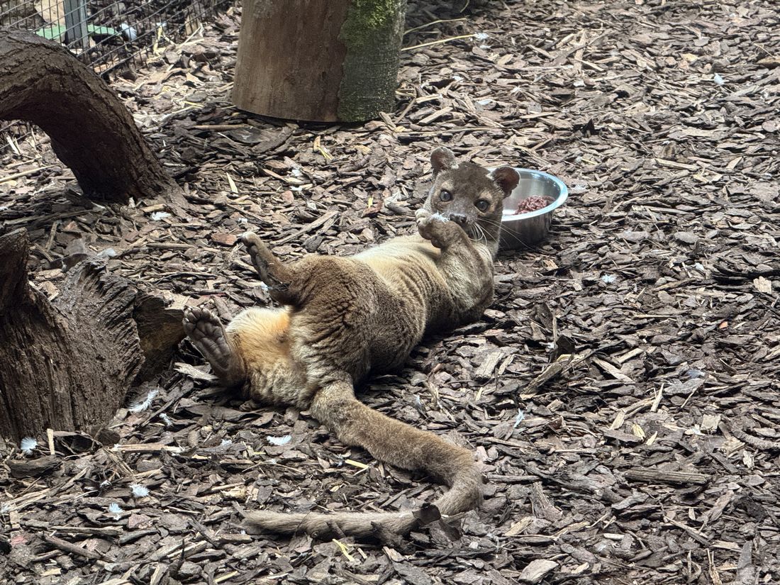 Das etwa achtjährige Fossa-Weibchen fällt auf, denn ihr fehlt das rechte Vorderbein. Als junges Tier ist sie in ihrer Heimat Madagaskar in eine Wildererschlinge geraten. Die madagassischen Behörden konnten TANA zwar retten und in eine Wildtier-Auffangstation bringen, ihr Bein war aber so schwer verletzt, dass das dort beschäftigte Veterinärteam es amputieren musste. Da sie mit drei Beinen in der Wildnis keinerlei Überlebenschance gehabt hätte, blieb sie in menschlicher Obhut und kam schließlich 2024 in den Zoo Duisburg, nachdem die madagassische Auffangstation schließen musste. In Duisburg werden das EAZA Ex-situ Zuchtprogramm (EEP) sowie das internationale Zuchtbuch (ISB) für die Fossas geführt. Jetzt soll das Weibchen in Frankfurt für Nachwuchs sorgen, denn TANA ist für die Zoopopulation der Fossas aufgrund ihrer Genetik sehr wertvoll.