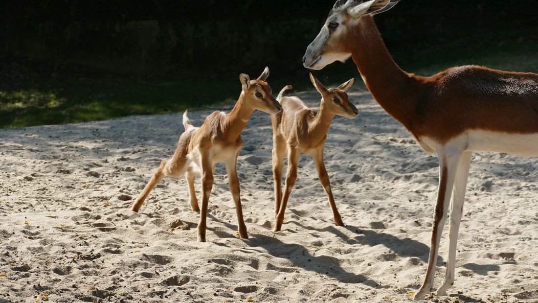 Mitte Juni gab es gleich zwei Mal Nachwuchs bei den hochbedrohten Mhorrgazellen im Frankfurter Zoo. Die beiden Jungtiere verbrachten die ersten Tage vorwiegend schlafend und gut versteckt auf ihrer großen Anlage. Mittlerweile sind sie mit ihren Müttern im Gehege unterwegs, das sich die Mhorrgazellen mit den Addax-Antilopen teilen.