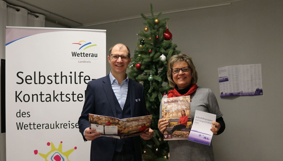 Landrat Jan Weckler hat gemeinsam mit Anette Obleser von der Selbsthilfe-Kontaktstelle des Wetteraukreises das neue Heft vorgestellt.