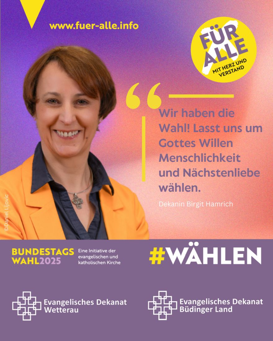 „Lassen Sie uns jetzt alle miteinander dazu beitragen, dass wir weiterhin in einem freien und demokratischen Land leben. Wie schnell das kippt, lehrt uns unsere Geschichte. Noch können wir uns entscheiden für Menschenwürde, Nächstenliebe und Zusammenhalt. Nutzen Sie am 23. Februar Ihr Wahlrecht!“, sagt Birgit Hamrich, Dekanin im Büdinger Land.
