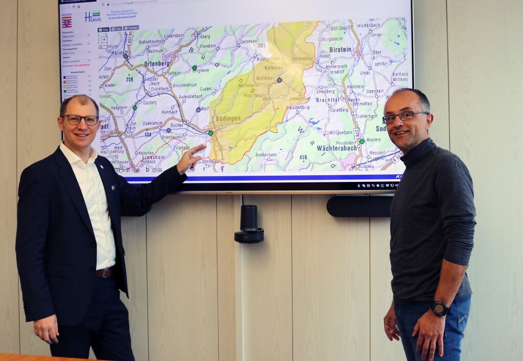 Foto: Thomas Buch erläutert Landrat Jan Wecker die Funktionsweise der Hochwasserwarnung im Internet.