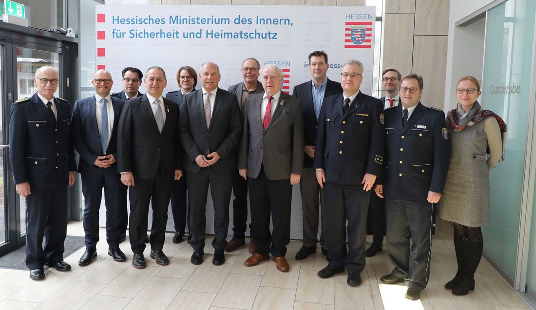 Innenminister Roman Poseck mit dem Präsidenten der IGMK, Herrn Dietmar Jerger, Vertretern der Karnevalsvereine, des HMdI und der Polizei. © HMdI