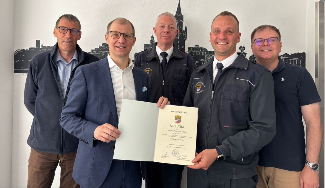Landrat Jan Weckler (2. von links) übergibt dem neuen Kreisbrandmeister Nicklas Rodriguez-Lopez (2. von rechts) die Ernennungsurkunde. Glückwünsche kommen vom Leiter des Fachbereichs Gesundheit und Bevölkerungsschutz, Prof. Dr. Reinhold Merbs, Kreisbrandinspektor Lars Henrich und dem Fachdienstleiter Gesundheit und Gefahrenabwehr, Jürgen Nickel (von links).