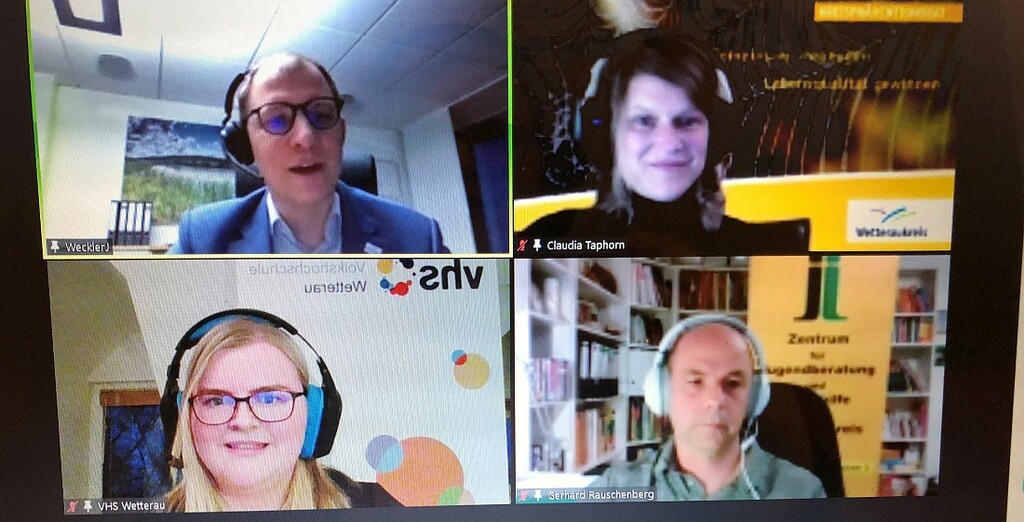 Foto: Landrat Jan Weckler gemeinsam mit dem Referenten Gerhard Rauschenberg vom Zentrum für Jugendberatung und Suchthilfe, Claudia Taphorn vom Kreispräventionsrat und Anna Möller von der Volkshochschule Wetterau.