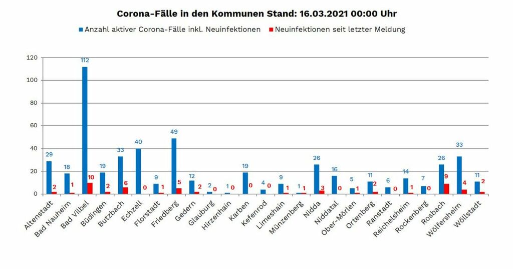 Die Zahl der seit Beginn der Pandemie nachgewiesenen Fälle von Corona-Infektionen im Wetteraukreis liegt am Dienstag (16. März) bei 9.507, das sind neun mehr als am Montag gemeldet. Die Zahl der aktiven Krankheitsfälle liegt bei 512. Neuinfektionen wurden gemeldet aus Altenstadt (2), Bad Nauheim (1), Bad Vilbel (10), Büdingen (2), Butzbach (6), Florstadt (1), Friedberg (5), Gedern (2), Limeshain (1), Münzenberg (1), Nidda (3), Ober Mörlen (1), Ortenberg (2), Reichelsheim (1), Rosbach (9), Wölfersheim (4) und Wöllstadt (2).