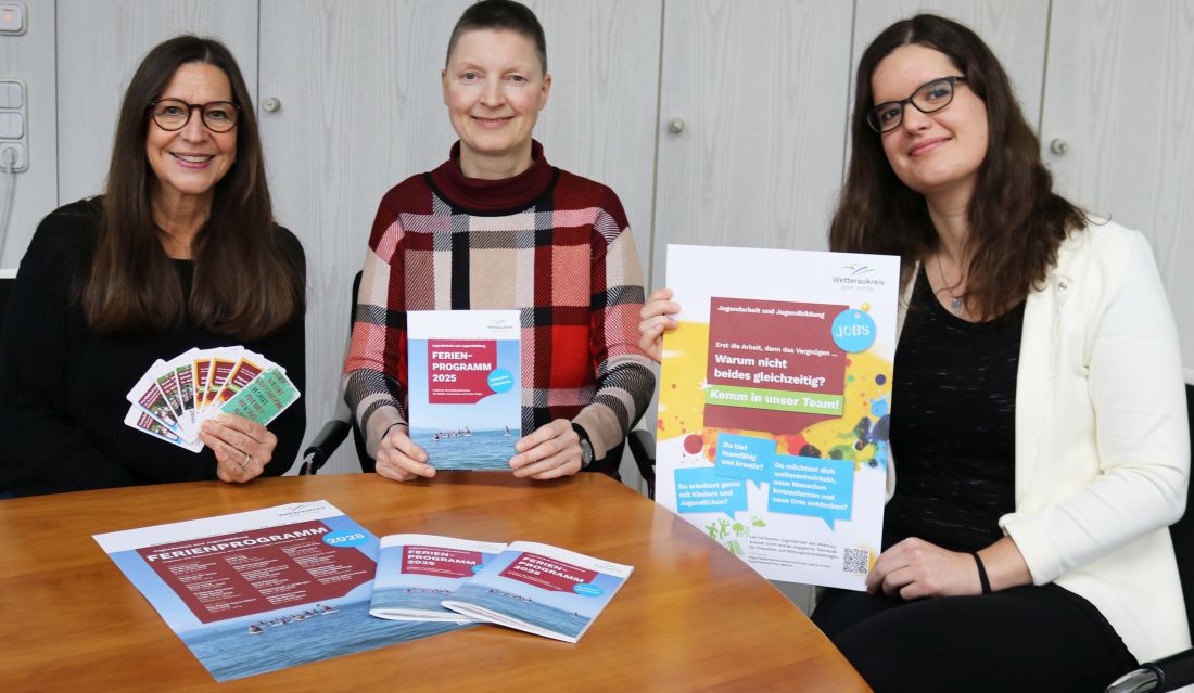 Kreisbeigeordnete Marion Götz (Mitte) bei der Vorstellung des neuen Ferien- und Bildungsprogramms 2025 mit (links) Christiane Volk (Fachstellenleitung Jugendarbeit und Jugendgerichtshilfe) und Josephin Koch (Fachstelle Jugendarbeit und Jugendgerichtshilfe).