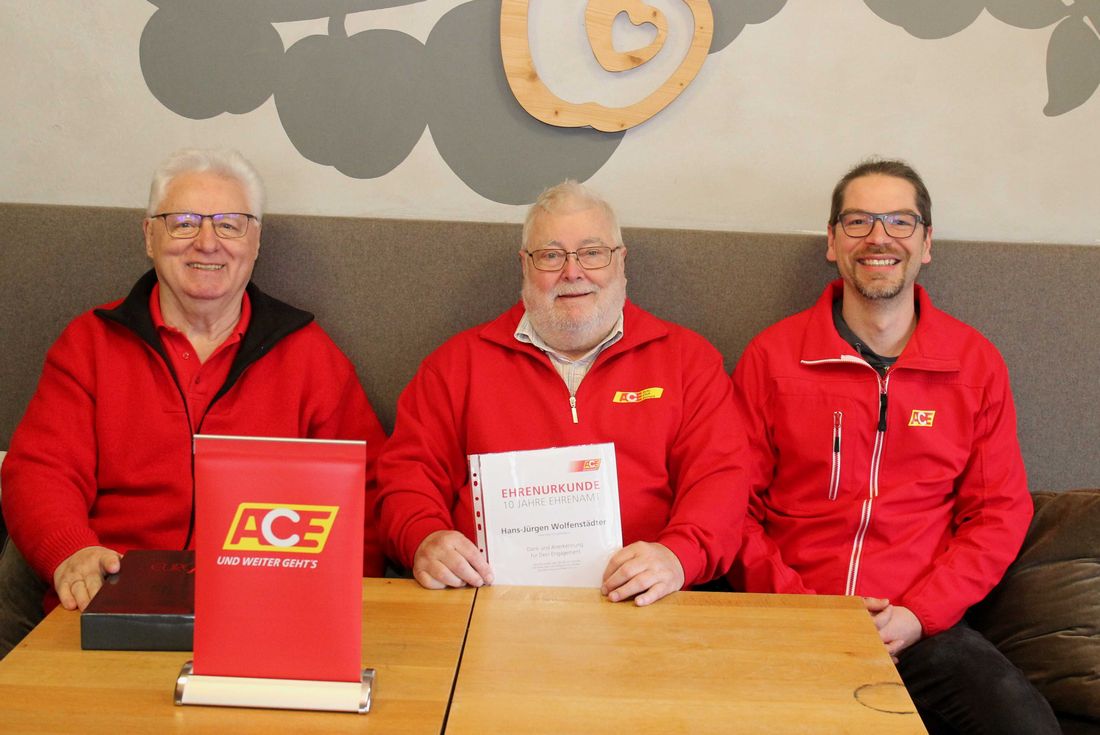 Regionalbeauftragter Sascha Rehberg (rechts) und Pressesprecher Anton Hofmann (links) übergaben im „Paradieschen“ in Linsengericht-Altenhaßlau dem Jubilar Hans-Jürgen Wolfenstädter (Mitte) die Urkunde, ein Präsent und die Ehrennadel für 10 Jahre im Ehrenamt beim ACE Auto Club Europa im Kreis Main-Kinzig und Wetterau.