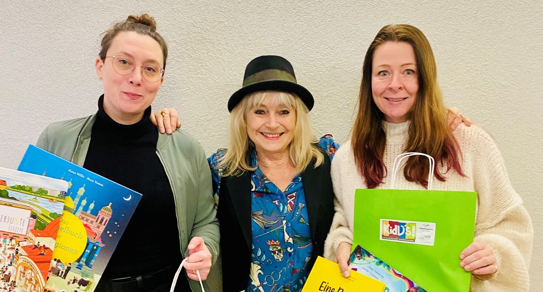Viola Rabien (links) präsentiert gemeinsam mit Schauspielerin Lilli Schwethelm (Mitte) und Inga Tscholitsch die Büchergeschenktüten.