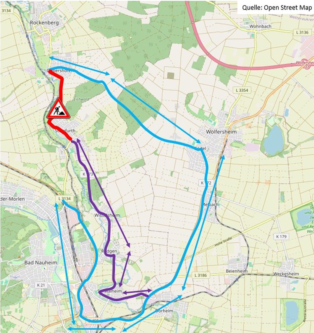 Die Umleitung für den überörtlichen Verkehr erfolgt von Rockenberg/Oppershofen über Wölfersheim/Södel und auf der B 455 an Friedberg/Dorheim vorbei zur B3 über Friedberg und Bad Nauheim Richtung Steinfurth, Rockenberg/Oppershofen und umgekehrt. Für Fahrzeuge, die die Kraftfahrstraße B 3 nicht befahren dürfen, wird eine alternative Umleitung über Bad Nauheim/Schwalheim und Bad Nauheim/Rödgen ausgewiesen.