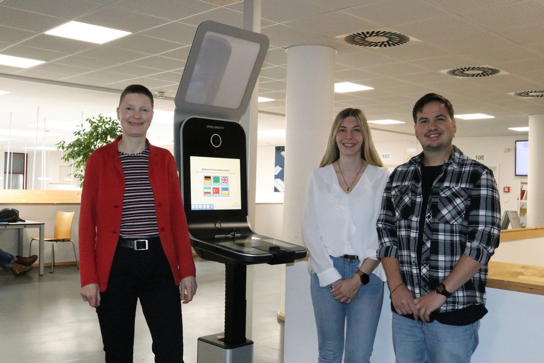 Kreisbeigeordnete Marion Götz (links), Björn Gehring von der Fachstelle Führerscheinangelegenheiten und Alisa Ambron von der Fachstelle für Allgemeine Aufenthaltsangelegenheiten testen die Funktionsweise der neu aufgestellten Selbstbedienungs-Terminals in der Ausländer- und Führerscheinbehörde der Kreisverwaltung in Friedberg.