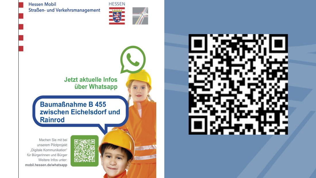 Hessen Mobil versorgt Bürgerinnen und Bürger ab sofort per WhatsApp mit aktuellen Informationen zur baldigen Baumaßnahme an der B 455 zwischen Eichelsdorf und Rainrod. Verkehrsteilnehmende erhalten direkte Updates zu Baufortschritt, Verkehrsführung und Umleitungen – schnell und unkompliziert aufs Smartphone.