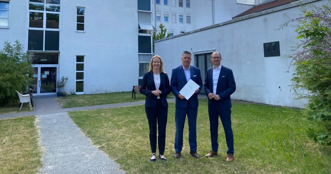 In Zukunft will man das stationäre Angebot am Hochwaldkrankenhaus konzentrieren und damit die dortige Bettenzahl auf rund 430 erhöhen. Für die nächste Phase der Erweiterung des Standorts in Bad Nauheim haben Landrat Jan Weckler und die Erste Kreisbeigeordnete Birgit Weckler jetzt die Baugenehmigung an GZW-Geschäftsführer Dr. Dirk Fellermann übergeben. „Der Wetteraukreis braucht eine zuverlässige und zukunftsorientierte medizinische Versorgung. Die Krankenhausreform setzt auf Konzentrationsmaßnahmen, um ein qualitativ hochwertiges Angebot in den betreffenden Kliniken sicherzustellen. Mit der nun übergebenen Baugenehmigung für den nächsten Abschnitt der Erweiterung des Hochwaldkrankenhauses geht das GZW genau diesen zukunftsweisenden Weg weiter“, erklärt der Landrat, der auch Aufsichtsratsvorsitzender des GZW ist, bei der Bescheid-Übergabe. Jan Weckler verweist in diesem Zusammenhang noch einmal darauf, dass der Kreis erst im vergangenen September die Anteile der Stadt Bad Nauheim am GZW übernommen habe und somit nun 91,51 Prozent der GmbH halte. „Unser Ziel war und ist es, mit diesem Schritt die Gesundheitsversorgung im Kreis dauerhaft zu sichern“, sagt der Landrat auch mit Blick auf den 30-Millionen-Euro-Zuschuss für die Baumaßnahme am Hochwaldkrankenhaus. Damit schloss der Kreis eine Finanzierungslücke des Ausbaus, dessen Gesamtkosten sich auf 130 Millionen Euro belaufen. Neben einer Erhöhung des Stammkapitals der Gesellschaft um 15 Millionen investiert er damit 45 Millionen Euro in das Gesundheitszentrum Wetterau. Darüber hinaus sichert er die Liquidität des GZW durch eine Bürgschaft von elf Millionen Euro ab, übernimmt Rückzahlungsgarantien für laufende Darlehen und kaufte für 4,2 Millionen Euro Grundstück und Gebäude der Gourmet-Werkstatt in Bad Nauheim, die unter anderem das GZW und Bereiche der Kerckhoff-Klinik mit Essen versorgt.