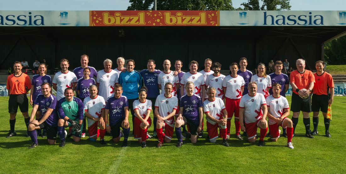 Im Traditionsspiel auf dem Hessentag in Bad Vilbel hat die Fußballmannschaft der Evangelischen Kirche in Hessen und Nassau gegen die hessische Landtagself einen klaren Sieg errungen. Doch freuen konnten sich am Ende nicht nur die Spielerinnen und Spieler der Pfarrelf: Im Rahmen des Benefizspiels spendeten die Kirche und der Landtag je 500€ für die Jugendarbeit des FV Bad Vilbel e.V..