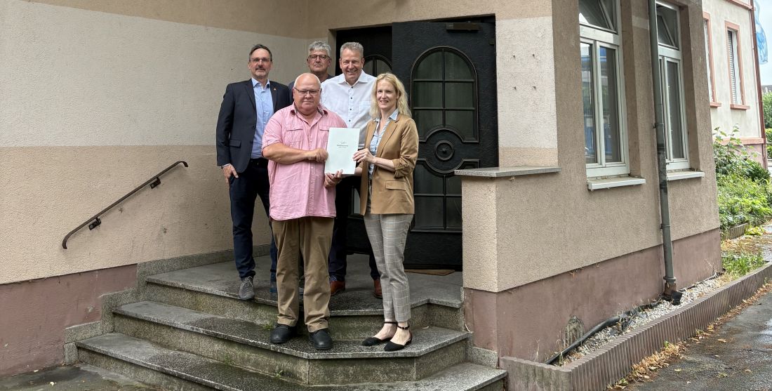 Die Erste Kreisbeigeordnete Birgit Weckler übergibt im Beisein von Karbens Bürgermeister Guido Rahn die Baugenehmigung zur Nutzungsänderung des ehemaligen Gasthauses „Gehspitze“ an Bauherr Norbert Kling von der Kling GmbH (vorne) und dessen Mitarbeiter Stefan Körber (von rechts). Vom Berufsbildungswerk Südhessen, das das Gebäude künftig als Mieter nutzen wird, ist Uwe Könecke vor Ort (links).
