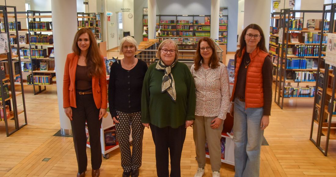 Foto: v.l. Shiba Bühlmeyer, Leiterin der Evangelischen Familienbildung Wetterau, Karin Krause-Buss, Ulrike Ludwigkowski, Heidrun Kroeger-Koch und Birgit Bergmann, Bibliotheksleiterin. (Foto: Hortien)