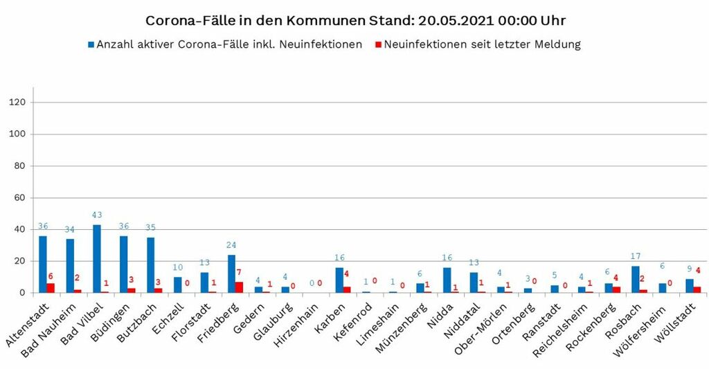 Neuinfektionen wurden gemeldet aus: Altenstadt (6), Bad Nauheim (2), Bad Vilbel (1), Büdingen (3), Butzbach (3), Florstadt (1), Friedberg (7), Gedern (1), Karben (4), Münzenberg (1), Nidda (1), Niddatal (1), Ober Mörlen (1), Reichelsheim (1), Rockenberg (4), Rosbach (2) und Wöllstadt (4). Ein Infektionsfall wurde nachträglich einer Kommune zugeordnet.