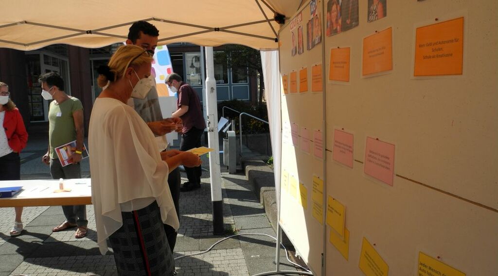 Auf dem Europaplatz waren drei Pavillons aufgebaut, die Dorothee Schätzle vom Grundbildungszentrum Wetterau (GBZ) in ihrer Begrüßung erläuterte. So konnte am Selbsterfahrungspavillon ausprobiert werden, wie es sich anfühlt, schlecht lesen zu können: Spiegelverkehrte Texte, Texte in Sütterlin geschrieben oder mit Auslassungen, wobei die Buchstaben zwar richtig, aber die Zwischenräume zwischen den Wörtern falsch gesetzt waren, so dass der Sinn sich nur erschwert erfassen ließ. Am Politikpavillon ging es um politische Inhalte in einfacher und normaler Sprache und der dritte Pavillon war dem Austausch mit den Gästen gewidmet.