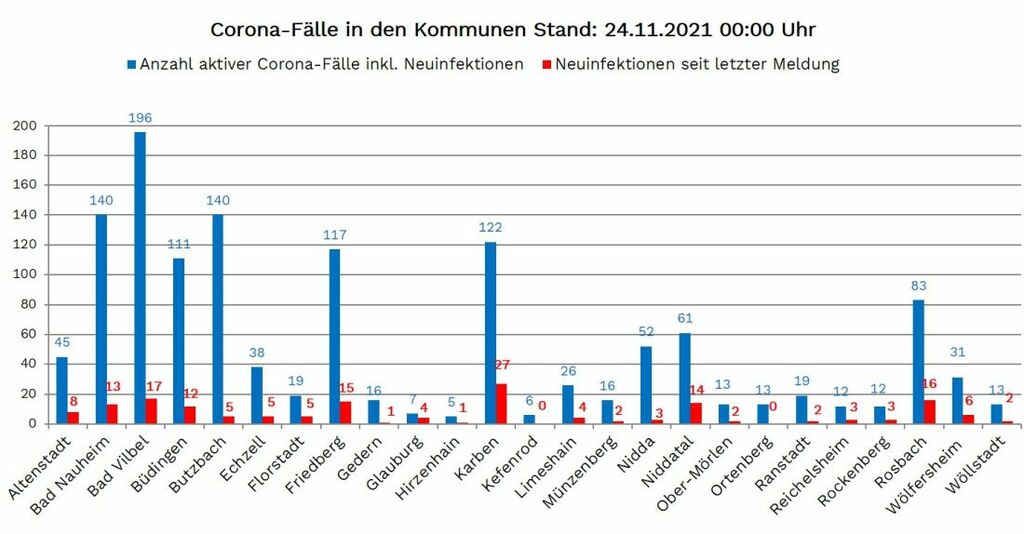 Neuinfektionen wurden aus 23 von 25 Wetterauer Kommunen gemeldet: Altenstadt 8, Bad Nauheim 13, Bad Vilbel 17, Büdingen 12, Butzbach 5, Echzell 5, Florstadt 5, Friedberg 15, Gedern 1, Glauburg 4, Hirzenhain 1, Karben 27, Limeshain 4, Münzenberg 2, Nidda 3, Niddatal 14, Ober Mörlen 2, Ranstadt 2, Reichelsheim 3, Rockenberg 3, Rosbach 16, Wölfersheim 6 und Wöllstadt 2.