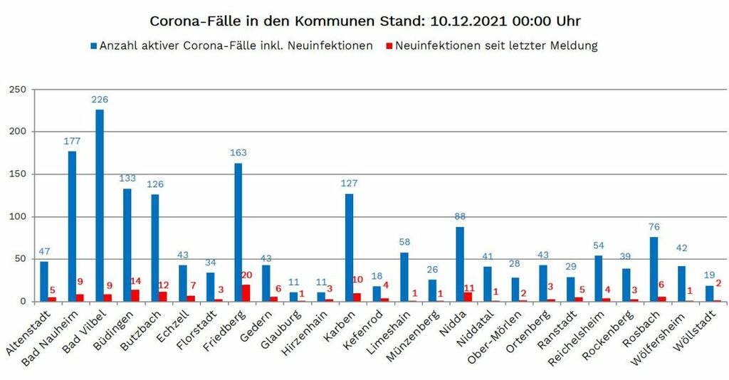 Neuinfektionen wurden aus allen 25 Kommunen im Wetteraukreis gemeldet Altenstadt 5, Bad Nauheim 9, Bad Vilbel 9, Büdingen 14, Butzbach 12, Echzell 7, Florstadt 3, Friedberg 20, Gedern 6, Glauburg 1, Hirzenhain 3, Karben 10, Kefenrod 4, Limeshain 1, Münzenberg 1, Nidda 11, Niddatal 1, Ober Mörlen 2, Ortenberg 3, Ranstadt 5, Reichelsheim 4, Rockenberg 3, Rosbach 6, Wölfersheim 1 und Wöllstadt 2.