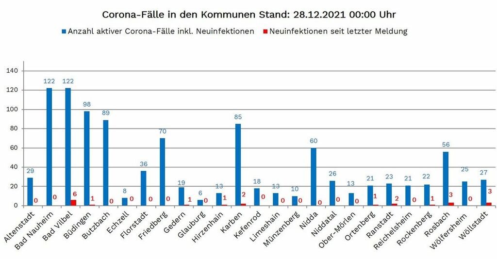 Die Zahl der seit Beginn der Pandemie nachgewiesenen Fälle von Corona-Infektionen im Wetteraukreis liegt am Dienstag (28. Dezember) bei 21.946, 21 mehr als am Montag gemeldet. Die Inzidenz, die Zahl der Neuinfektionen pro 100.000 Einwohner binnen sieben Tagen, liegt laut RKI bei 143,4. Neuinfektionen wurden aus allen zehn von 25 Kommunen gemeldet: Bad Vilbel 6, Büdingen 1, Gedern 1, Hirzenhain 1, Karben 2, Ortenberg 1, Ranstadt 2, Rockenberg 1, Rosbach 3 und Wöllstadt 3.