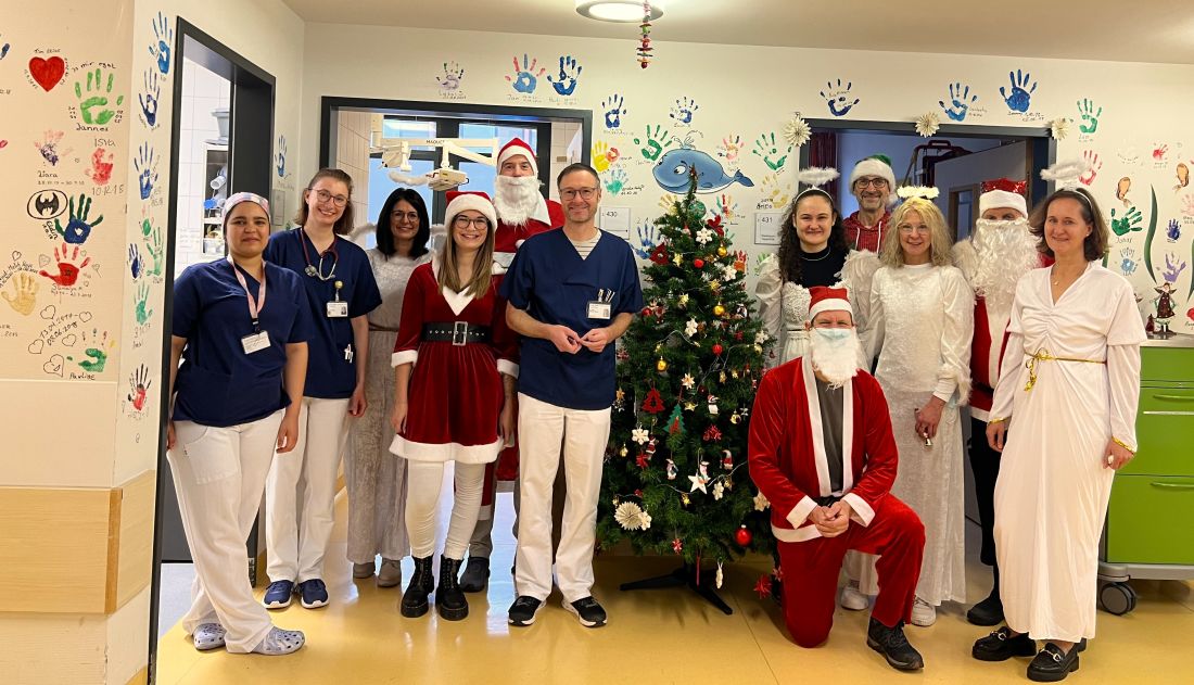 Die Delegation der Tour der Hoffnung besuchte am Samstagvormittag diesmal nicht nur die Station Peiper, sondern auch alle anderen Kinder und Jugendlichen im Universitätsklinikum Gießen-Marburg am Standort in Gießen, die besucht werden durften. Sogar in der Notaufnahme freuten sich Wartende über eine kleine Aufmerksamkeit. Neben Süßigkeiten warteten in den großen Jutesäcken auch Stofflöwen, Lastwagen, Malsets und Fußbälle auf die Verteilung. Für die medizinischen und pflegerischen Teams gab es auch Nervennahrung für die vorweihnachtliche Zeit. Und immer wieder gab es die Frage: „Dürfen wir ein Foto mit euch machen?“ Auf der Station Peiper gesellten sich Oberarzt Dr. Matthias Braun, Assistenzärztin Julia Stengel und Schwester Dali Ebtihel zu der Nikolausbande.