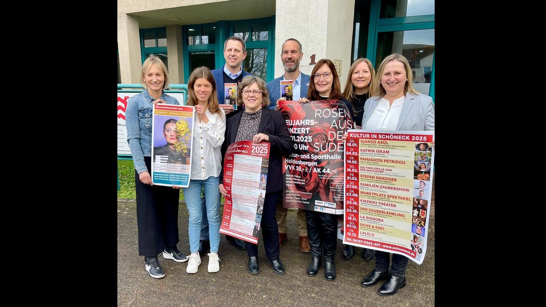 Altenstadt, Nidderau und Schöneck machen in Sachen Kultur weiter gemeinsame Sache: Maika Janat-Vennemann, Jahrespraktikantin Frau Jurinic, Dominik Imhof, Julia Huneke, Andreas Bär, Marion Schröder, Mara Wahle und Carina Wacker (von links) präsentieren das Kulturprogramm 2025.
