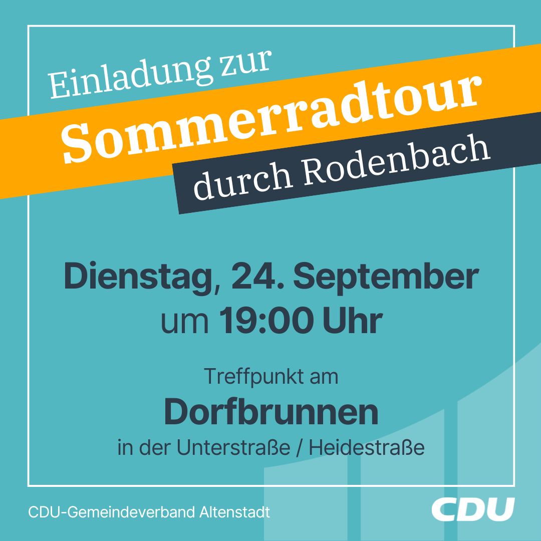 „Unsere Sommertour möchte direkt vor Ort über wichtige Projekte und Themen informieren und zugleich die Meinungen und Ideen der Bürgerinnen und Bürgern hierzu einholen", sagt Sven Müller-Winter, Fraktionsvorsitzender der CDU-Altenstadt. „Wir freuen uns auf den gemeinsamen Austausch und eine rege Teilnahme."