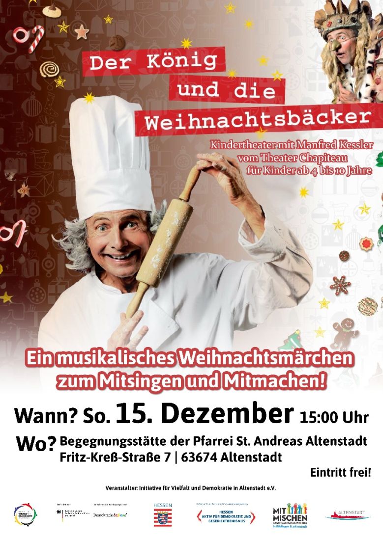 Altenstadt – Für kommenden Sonntag, den 15. Dezember 2024, lädt die Initiative für Vielfalt und Demokratie in Altenstadt e.V. um 15:00 Uhr zum musikalischen Weihnachtsmärchen "Der König und die Weihnachtsbäcker" in die Begegnungsstätte der Pfarrei St. Andreas Altenstadt (Fritz-Kreß-Straße 7) ein. Der Eintritt ist frei.