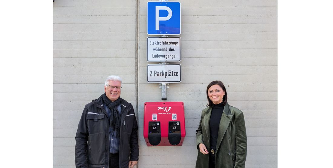 Bauhofleiter Wolfgang Triebert und Bürgermeisterin Olga Schneider vor der E-Ladestation an der Wettertalhalle.