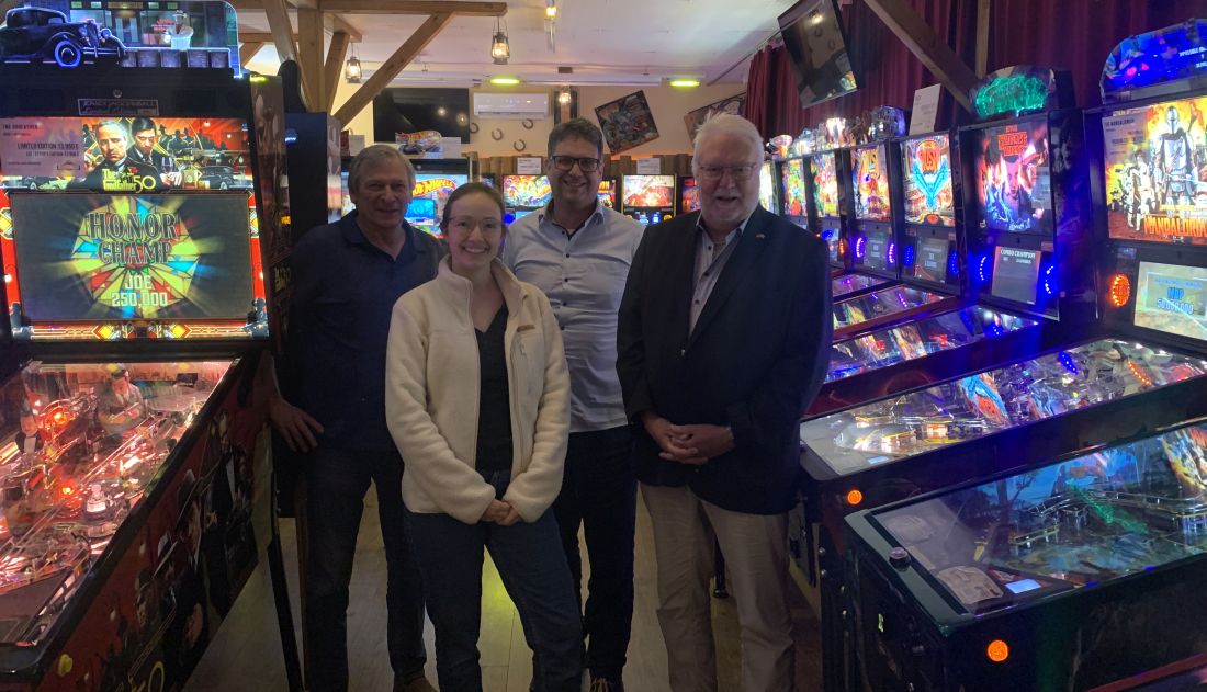Umfassend stellten die Familienunternehmer ihre Events vor. Man sei schon zweimal Ausrichter der WM gewesen, ein umfangreiches Unterfangen, das aber sehr viel Spass und dann auch grosse Bekanntheit bedeutet. Regelmässig gäbe es jeden letzten Samstag im Monat 9 Stunden Flippern nach Lust und Laune. Besonders auf die Wünsche der Kunden könne man bei Firmenevents oder Familienfesten eingehen. „Das ist eine sehr gute Idee, als Vizepräsident der IHK Giessen Friedberg kann ich mir gut vorstellen, dass ich unseren Fachausschuss gerne mal nach Echzell einladen werde,“ so Jochen Ruths, FDP Kreistagsabgeordnete und ehrenamtlich in einigen Verbänden aktiv.