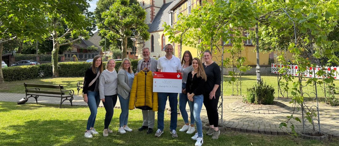 Gelbe Kultjacke unter dem Auktionshammer: Bürgermeister Wilfried Mogk (4. V. l.) ersteigerte die Jacke seines Nachfolgers Raik Noll (5. V. l.) und freute sich zusammen mit den KiTa-Leitungen der vier Echzeller Kindergärten sowie den Elternbeiräten über die Spende.