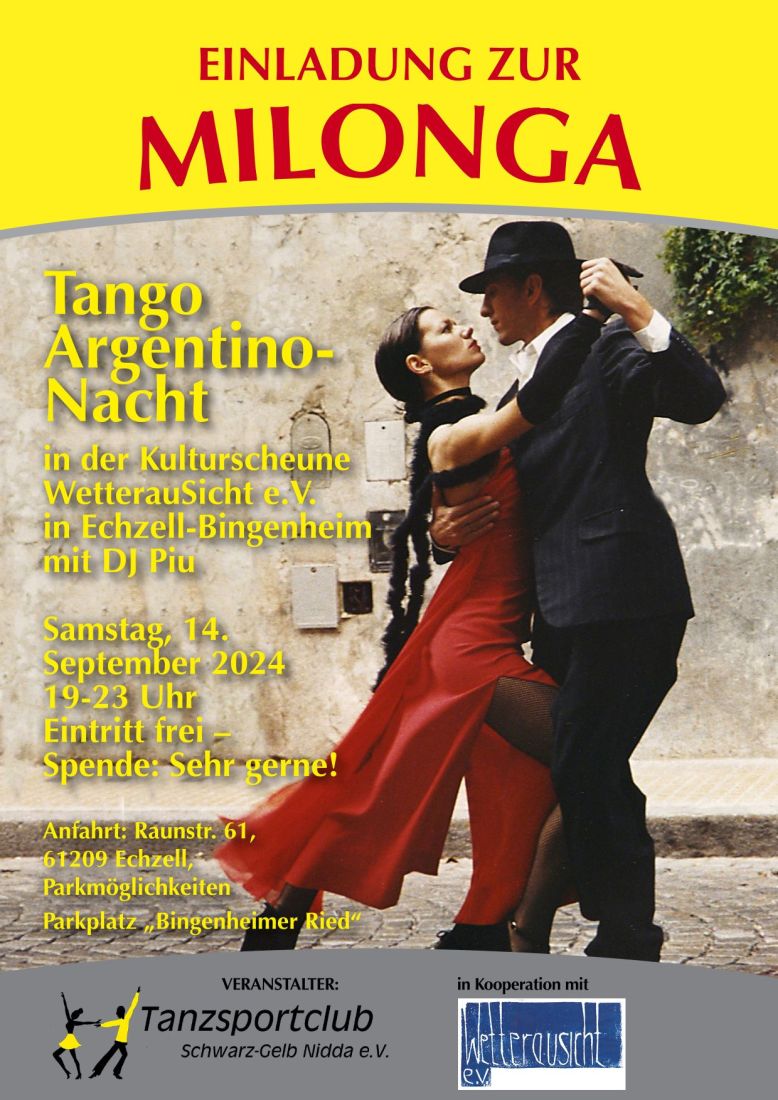 Erstmals lädt der Tanzsportclub Schwarz-Gelb Nidda in Kooperation mit dem Wetterausicht e.V. in die Kulturscheune zur großen Tango Argentino-Nacht ein. Die Musik kommt von DJ Piu. Der Eintritt ist kostenlos – Spenden sind willkommen. Tangueros und Tangueras aus der ganzen Region sind herzlich willkommen, mitten im Herzen der Wetterau in dem ganz besonderen Ambiente der Kulturscheune ihren Lieblingstanz zu tanzen.
