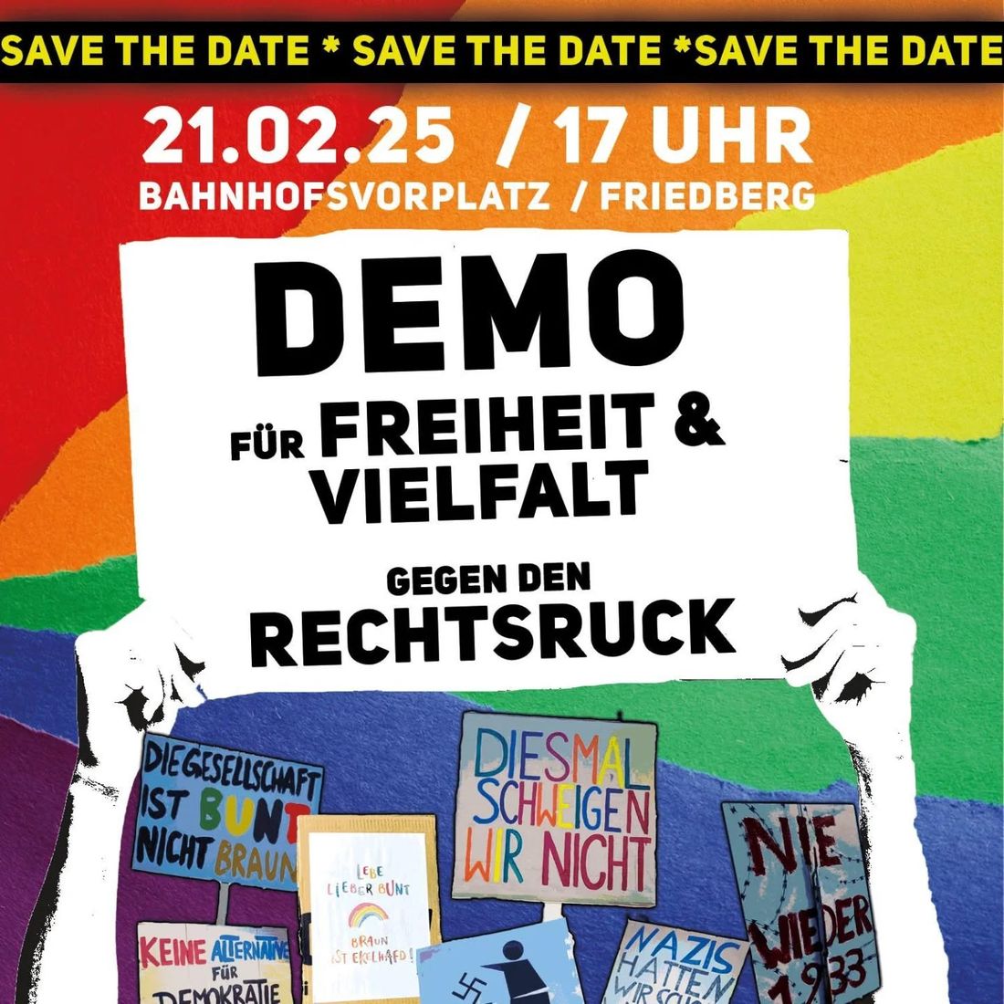 "Kurz vor der Bundestagswahl demonstrieren bundesweit tausende Menschen für die Demokratie und gegen die Spaltung der Gesellschaft. Auslöser der Proteste ist vor allem die Annäherung der CDU an die in Teilen rechtsextremistische AfD, in der Menschen wie der gerichtsfest als Faschist zu bezeichnende Björn Höcke das Sagen haben. Trotz der wiederholten Erklärungen des CDU-Spitzenkandidaten Friedrich Merz, dass man keinen Antrag in den Bundestag einbringen wolle, der auf die Stimmen der AfD angewiesen ist, hat man dieses Versprechen zur Verschärfung des Migrationsrechts gebrochen. Ausgerechnet am Tag, an dem im Bundestag der Befreiung des Konzentrationslagers Auschwitz gedacht wurde, hat die CDU die Brandmauer eingerissen, mit der sich demokratische Parteien bisher von der AfD abgegrenzt haben. Dieses Verhalten schadet der Demokratie. Auch in Friedberg gibt es das Bedürfnis, sich den menschenverachtenden Gedanken der extremen Rechten entgegenzustellen und ein deutliches Zeichen für Demokratie und Vielfalt zu setzen. Bereits vor einem Jahr haben in Friedberg fast 1000 Menschen unter dem Motto „Nie wieder ist jetzt! Friedberg" solidarisch gegen Rassismus, Faschismus und Antisemitismus“ demonstriert. Damals war der Auslöser für die bundesweite Protestwelle der Bericht des Rechercheteams Correctiv über Geheimpläne von Mitgliedern der AfD, der Werteunion und der Identitären. Die Geheimpläne sehen eine massenhafte Abschiebung von Migrantinnen und Migranten vor. Die Initiatoren weisen darauf hin, dass breite Proteste gegen rechtsextremistisches, menschenverachtendes Gedankengut durchaus den Effekt haben, den Stimmenanteil der rechtsextremen Parteien zu reduzieren und vor allem unentschlossene Wählerinnen und Wähler davon abhalten können, diesen Parteien ihre Stimme zu geben. In diesem Sinne – gegen den Rechtsruck - rufen wir dazu auf Gesicht zu zeigen und am Freitag den 21.2. um 17 Uhr in Friedberg auf die Straße zu gehen für Vielfältigkeit, Menschlichkeit und Solidarität", so die Organisatoren.