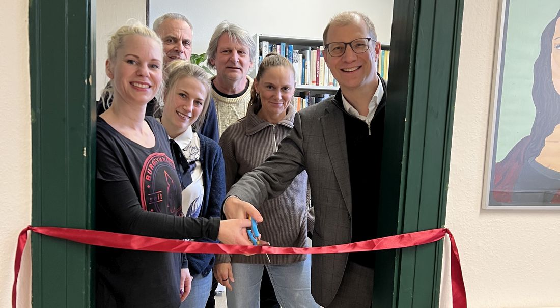 Landrat Jan Weckler (rechts) übergibt mit Fachsprecherin Kunst Ulrike Orton, Schulleiter Ingo Baumgarten, Lehrkraft Anne Fett, Fachsprecher Englisch Thomas Berlenbach und Lehrkraft Johanna Seliger (von links) die neue Teeküche ihrer Bestimmung.
