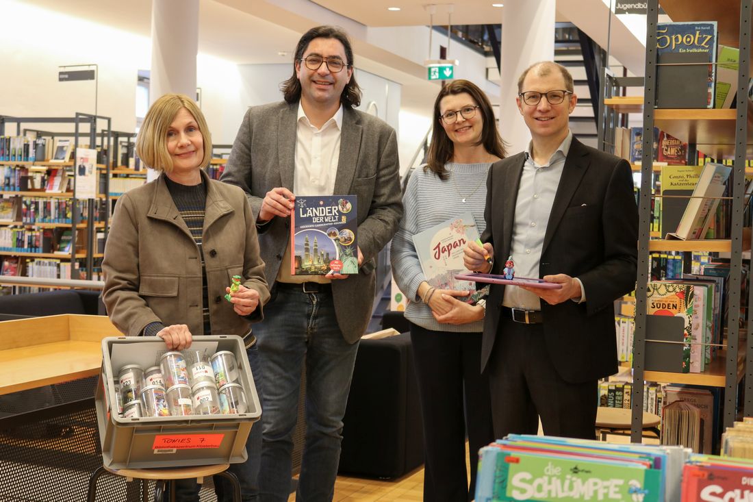 Die Bücher- und Medienkisten sind einsatzbereit (von links): Stellvertretende Leiterin Stephanie Roser, Bürgermeister Kjetil Dahlhaus, Landrat Jan Weckler und Leiterin Birgit Bergmann.