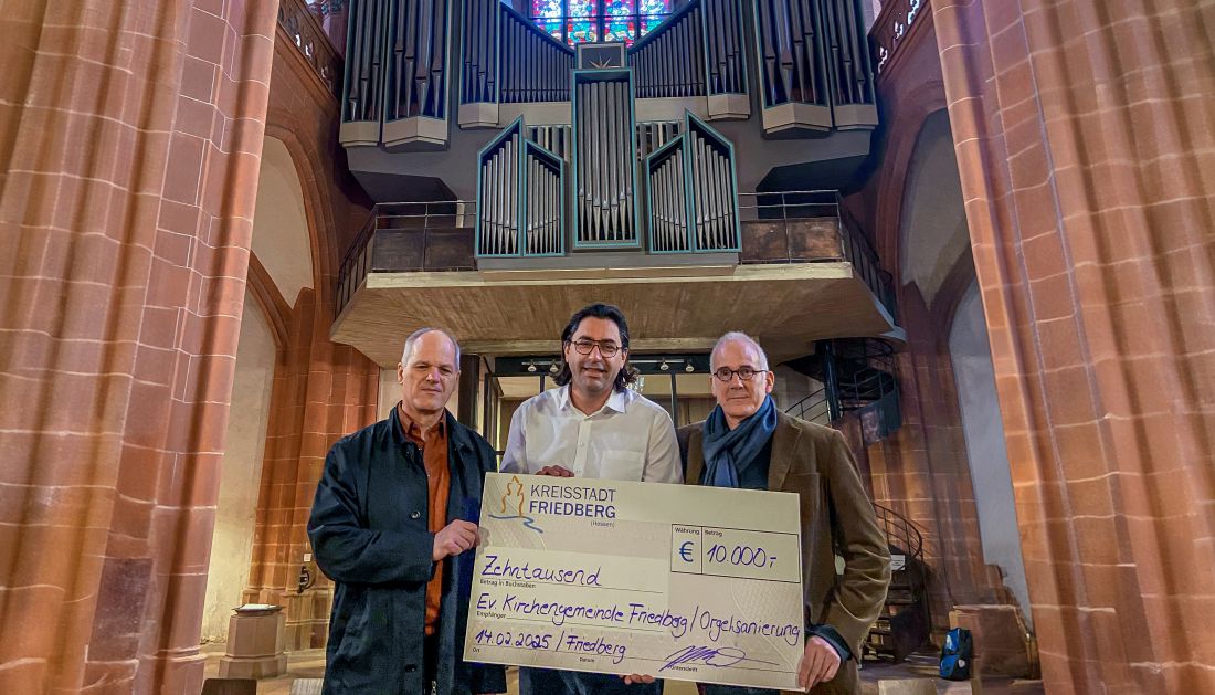 Bürgermeister Kjetil Dahlhaus überreichte gemeinsam mit Lukas Hölzinger, kommissarischer Leiter des Amtes für soziale und kulturelle Dienste und Einrichtungen, dem Kantor der evangelischen Kirchengemeinde Friedberg, Ulrich Seeger, einen symbolischen Scheck in Höhe von 10.000 € als städtischen Zuschuss. Die Gesamtkosten der Orgelsanierung liegen bei ca. 540.000,00 Euro, die durch ein zinsloses Darlehen der Evangelischen Kirche in Hessen und Nassau (EKHN) finanziert wurden. Dank einer breiten Unterstützung in der Bevölkerung konnten seit Sommer 2012 fast 428.000 Euro für das Orgelprojekt gesammelt werden.