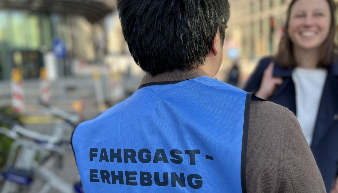 Die geschulten Interviewerinnen und Interviewer sind leicht zu erkennen: Sie tragen eine blaue Weste mit der Aufschrift „Fahrgasterhebung“ und einen Erhebungsausweis mit Namensschild, um sich auszuweisen. Nach einem gültigen Fahrschein fragen sie nicht.