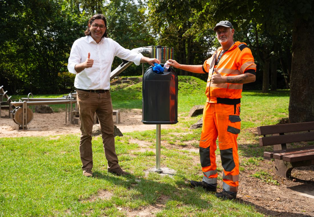 Bürgermeister Kjetil Dahlhaus und Baubetriebshofmitarbeiter Timo Gatial zeigen, wo der Abfall hingehört