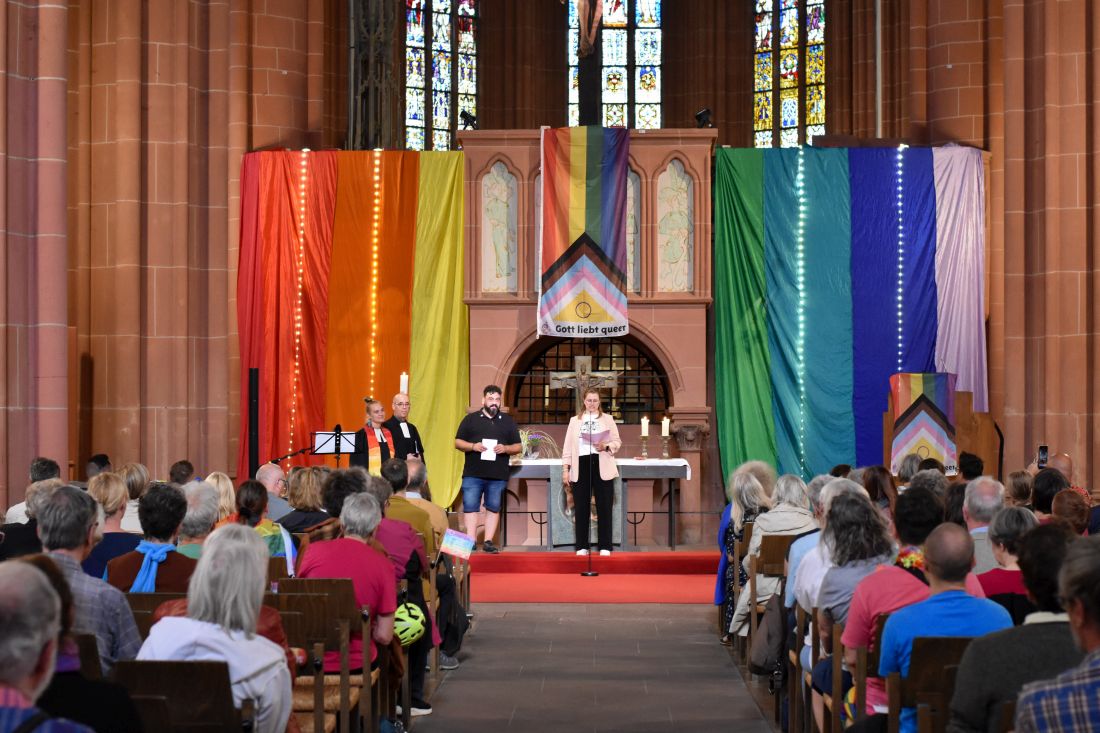 Bunte Fähnchen, Lichterketten und eine riesengroße Regenbogenflagge: Mit einem besonderen Gottesdienst in der Friedberger Stadtkirche begann am Freitagabend der erste Christopher-Street-Day in der Wetterau. Rund 150 Teilnehmende waren gekommen, um ein starkes Zeichen für eine offene, bunte und solidarische Gesellschaft zu setzen.