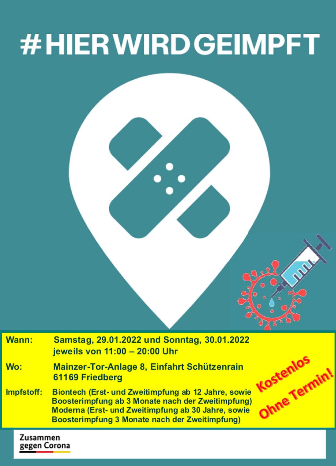 Die Aktion wird von Impfärzten aus dem Main-Kinzig-Kreis vorgenommen, und zwar am 29. und 30. Januar 2022 von jeweils 11 bis 20 Uhr in der Mainzer-Tor-Anlage 8 neben dem Rathaus, Einfahrt in den Innenhof von der Straße Schützenrain, 61169 Friedberg (Hessen). Dort stehen ausreichende Parkmöglichkeiten zur Verfügung und der Weg zum Impfangebot ist entsprechend beschildert.