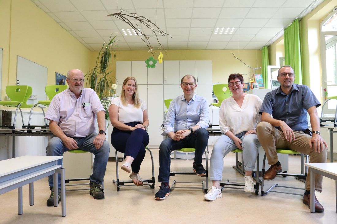 Haben es mindestens genauso bequem wie die Schülerinnen und Schüler in Zukunft: (von links) Hausmeister Kurt Heusohn, Schulleiterin Karin Schremser, Landrat Jan Weckler, Sekretariatskraft Diana Daubert und Alexander Hiemer (Fachbereichsleiter Hochbau).