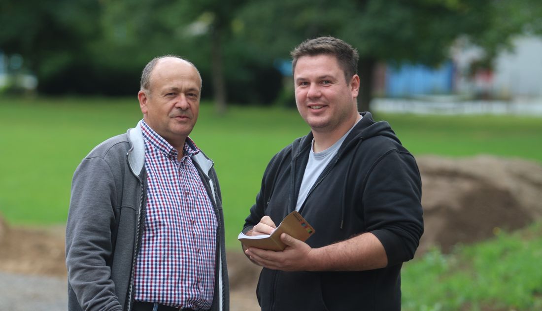 Erhard Heckert (l.) vom Bauamt Gedern und Christopher Blos, Bauleiter der Landesgartenschaugesellschaft, stimmen sich ab. Foto: LGS