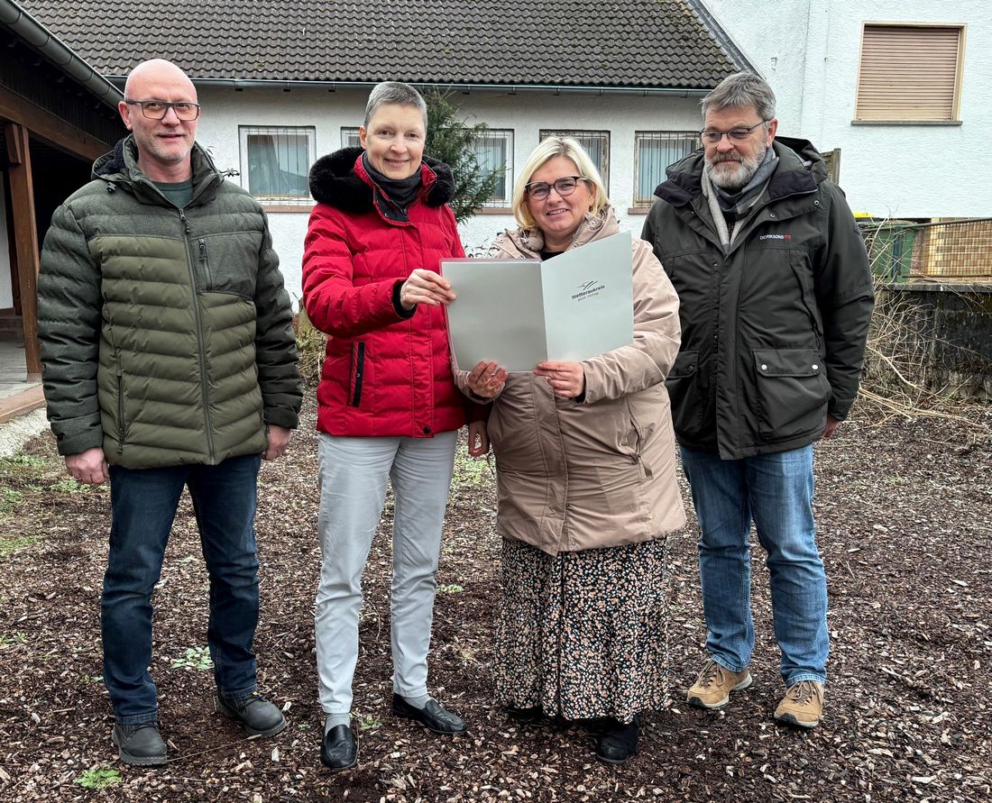 Kreisbeigeordnete Marion Götz (zweite von links) überreicht den Förderbescheid an Bürgermeisterin Henrike Strauch, mit dabei sind Willibald Goldbach (Bauamt Gemeinde Glauburg, links) und Volker Ullrich (Leiter des Bauamtes).