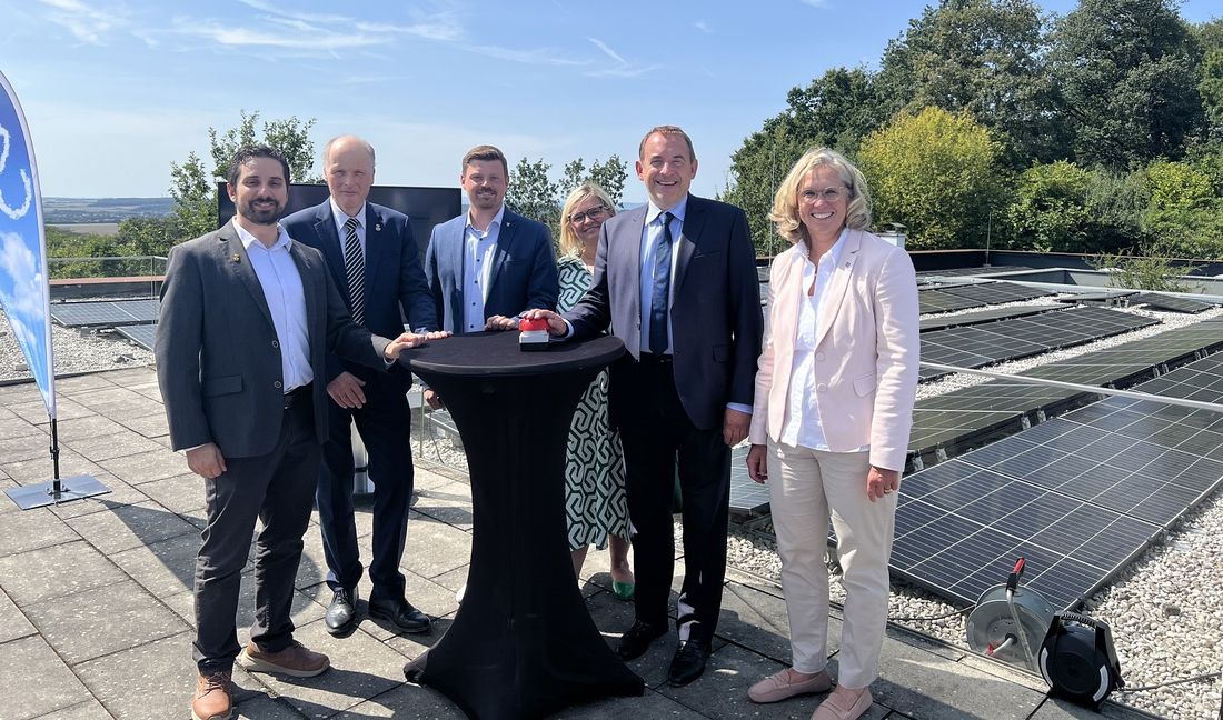 Hessens Finanzminister Professor Dr. R. Alexander Lorz (2.v.r.) nimmt mit Museumsdirektor Marcus Coesfeld, Landesarchäologe Professor Dr. Udo Recker, Patrick Appel (Mitglied des Landtags), Glauburgs Bürgermeisterin Henrike Strauch und der stellvertretenden LBIH-Direktorin Petra Zellner (von links) symbolisch die neue Photovoltaikanlage der Keltenwelt in Betrieb. Quelle: hmdf