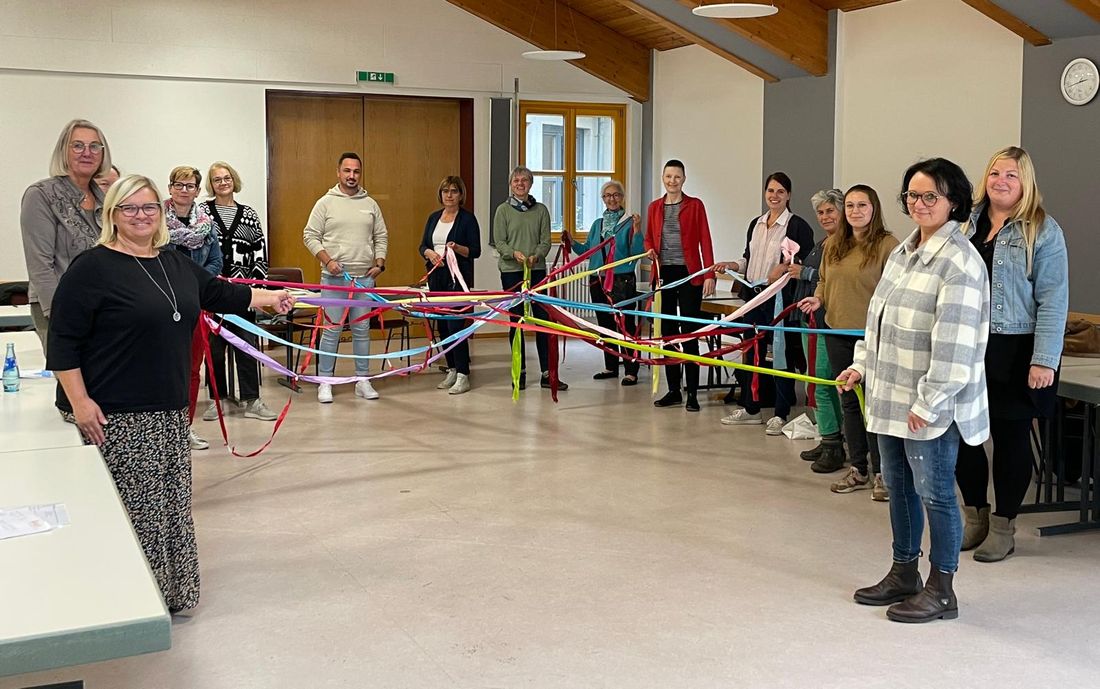 Gemeinsamer Einsatz für junge Familien: Kreisbeigeordnete Marion Götz (6. von rechts) besuchte den Netzwerkknoten Ost in Stockheim.