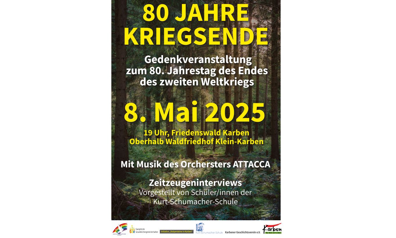 Ein Bündnis verschiedener Karbener Gruppen und Institutionen, rund um die Evangelische Kirche in Karben, die Stadt Karben und die Kurt-Schumacher-Schule, laden daher am 8. Mai um 19 Uhr zu einer Gedenkveranstaltung in den Karbener Friedenswald ein. Begleitet wird die Veranstaltung von Musikstücken des Orchesters Attacca. Nach einer Begrüßung von Karbens Erstem Stadtrat Thomas Schrage präsentieren Schülerinnen und Schüler der Kurt-Schumacher-Schule Zeitzeugeninterviews, die von der damaligen Situation in Karben und der Umgebung berichten.