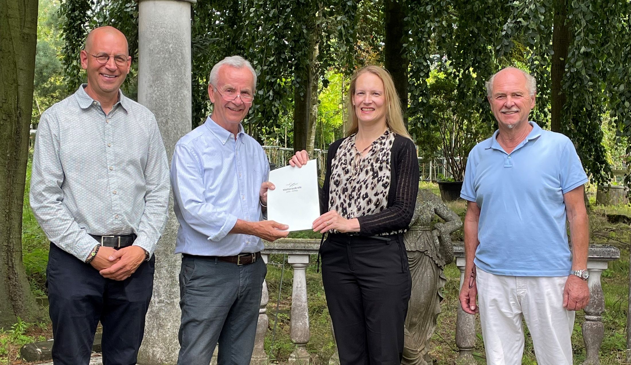 Von links: Architekt Thilo Meister, Thomas Geller, Geschäftsführer des „Vereins zur Pflege der Waldorfpädagogik“, Erste Kreisbeigeordnete Birgit Weckler sowie Magistratsmitglied Bodo Macho (Karben) freuen sich, dass es losgehen kann mit dem Bau der neuen Waldorfschule in Kloppenheim.