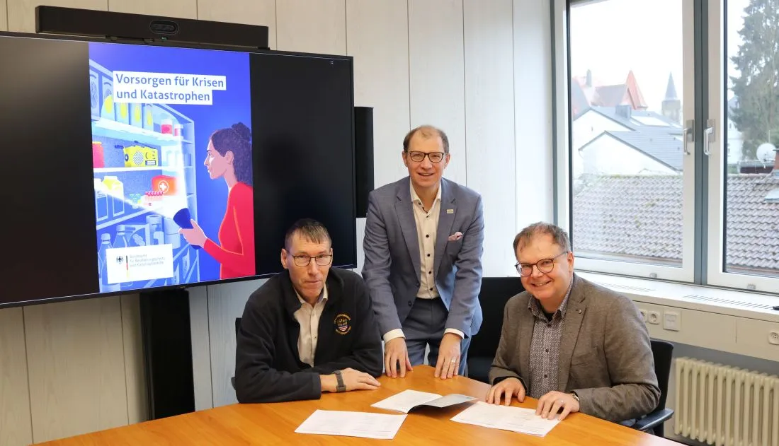 Richtig vorbereitet im Krisen- und Katastrophenfall: Damit die Bürgerinnen und Bürger wissen, wie sie sich bestmöglich auf den Ernstfall vorbereiten können, verweisen Landrat Jan Weckler (Mitte), der Fachbereichsleiter Gesundheit und Bevölkerungsschutz des Wetteraukreises, Prof. Dr. Reinhold Merbs (links), und der Fachdienstleiter Gesundheit und Gefahrenabwehr beim Kreis, Jürgen Nickel, auf ausführliche Informationen, die das Bundesamt für Bevölkerungsschutz und Katastrophenhilfe im Internet zur Verfügung stellt. Foto: Wetteraukreis